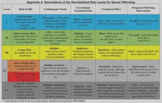 Level IVa/Above Average Risk: Individuals typically exhibit numerous chronic and severe criminogenic needs, limiting access to prosocial resources. The rate of sexual reoffending for level IVa is approximately double the average for those convicted of sexually motivated offenses. A significant reduction in reoffending is expected, with many transitioning to level III within a year or two through treatment or positive life changes. Most people in Level IVa are projected to transition to Level III after sufficient treatment, positive life changes, or 10 to 15 years of offense-free living in the community.